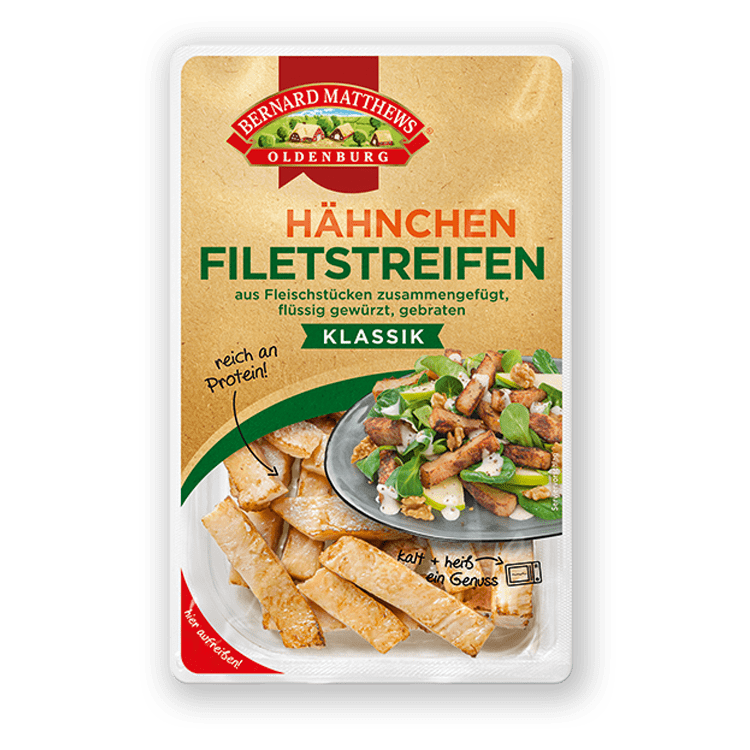 Unser Klassiker für den Salat, Wrap oder auch als Snack für Zwischendurch. Unsere Hähnchen-Filetstreifen werden aus dem zarten Hähnchenbrustfilet geschnitten und für Sie fertig gegart. Durch die einfache und schnelle Zubereitung in der Pfanne oder Mikrowelle werden unsere Hähnchen-Filetstreifen, egal ob heiß oder kalt, zur idealen Beilage, wenn es mal schnell gehen muss. Weiter überzeugen unsere Hähnchen-Filetstreifen durch ihren niedrigen Fettgehalt und sind gleichzeitig reich an Protein.
